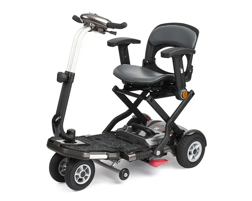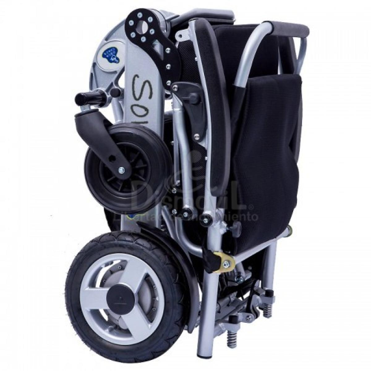Con ruedas antivuelco (laterales y traseras) que garantizan la seguridad del usuario y con llave de seguridad en la batería. Con asiento extraíble para facilitar su transporte. Sus 4 ruedas permiten moverla como un trolley una vez plegada.